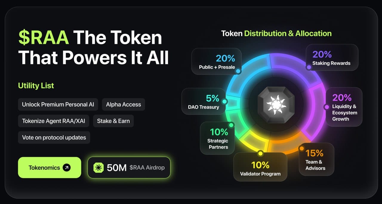 Total supply: 1 billion $RAA tokens. Fixed supply without inflation creates scarcity: