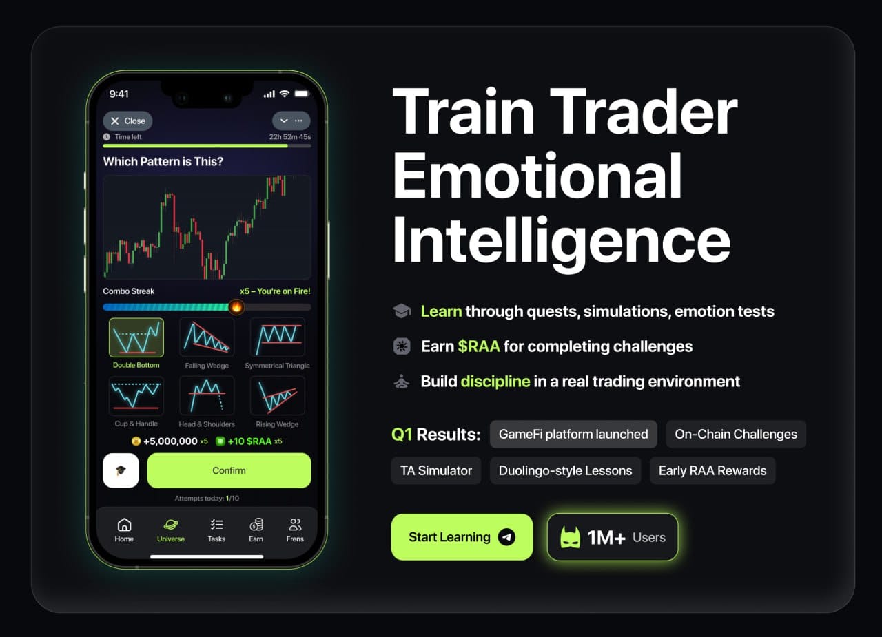 The protocol rewards learning with tokens: 50-200 RAA for courses, 25 RAA for 7-day consistency, 15 RAA for avoiding FOMO trades (AI-verified), 100 RAA for beating personal record with risk consideration. This creates a network effect: better traders → more revenue → better technology → even better traders.