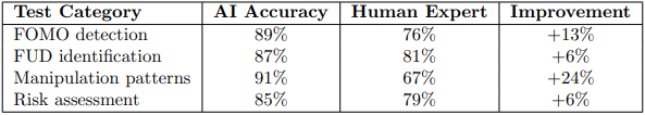 • AI Engine: 15 million training signals, recognition of 12 emotional states (FOMO 89%, FUD 87%, manipulation 91%), transformer architecture with custom embeddings
